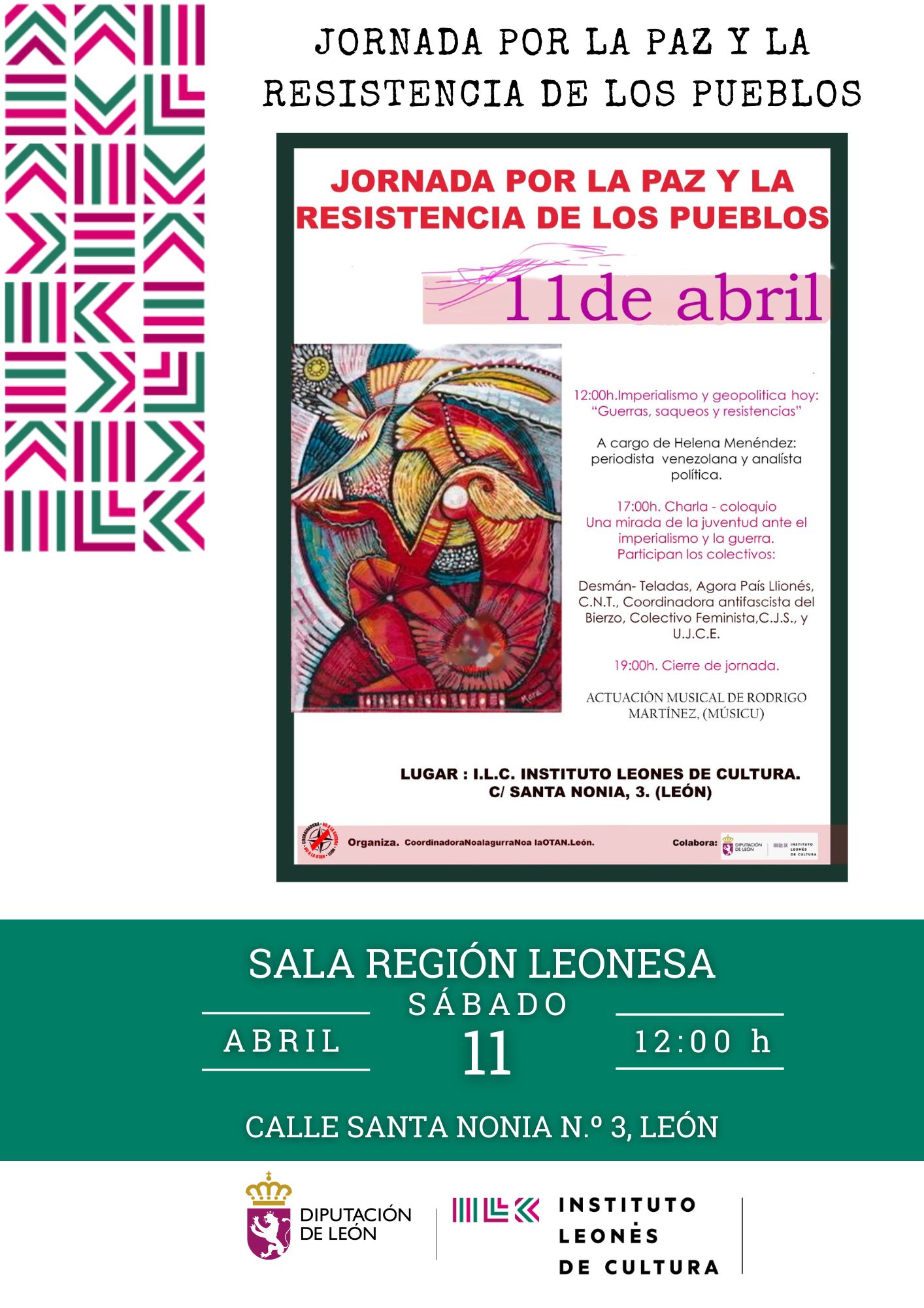 12:00h Conferencia «Guerras saqueos y resistencias», a cargo de Helena Menéndez (periodista venezolana y analista política) 17:00 Charla-coloquio «Una mirada de la juventud ante el imperialismo y la guerra»