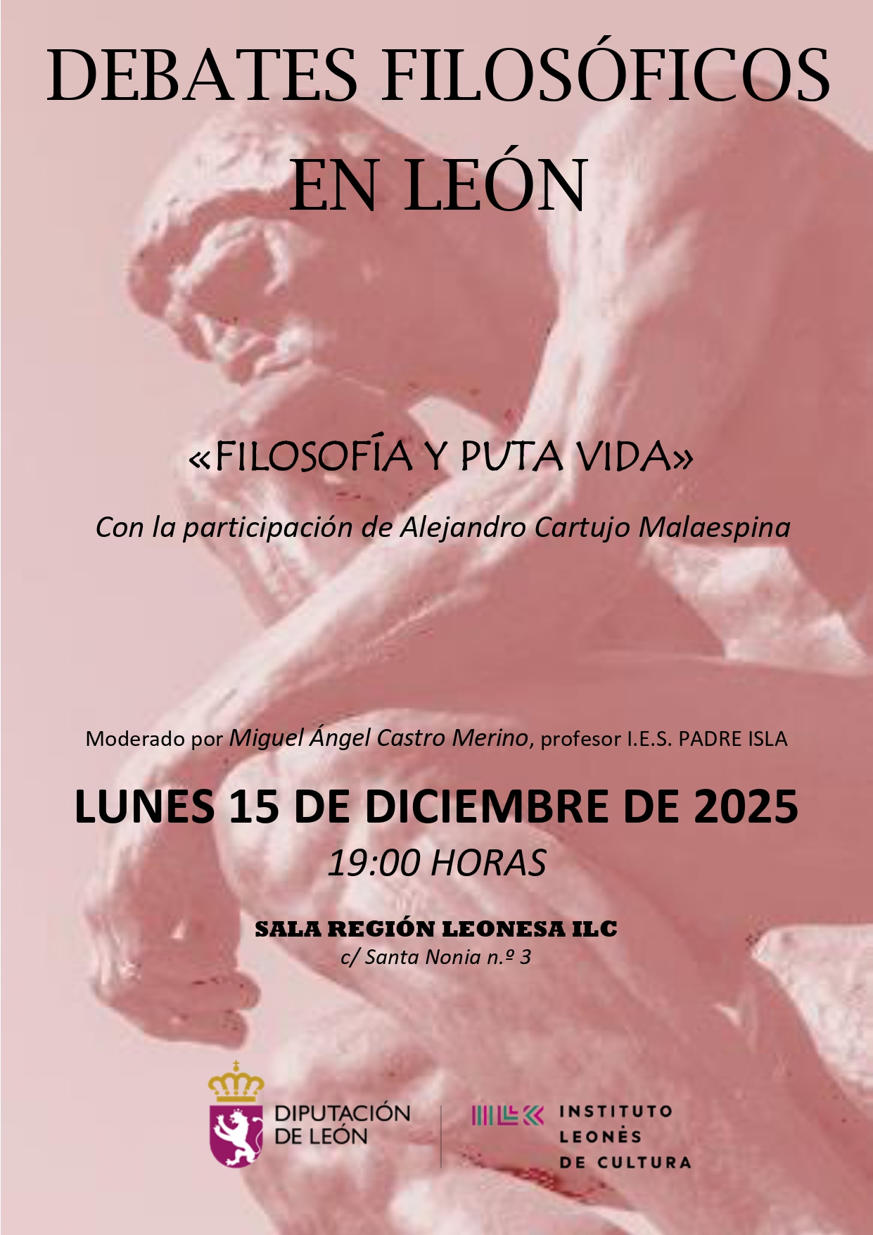 15 diciembre | 7:00 PM - 8:30 PM Debates filosóficos en León: «FILOSOFÍA Y PUTA VIDA», coordinado por Miguel Ángel Castro Merino y con la participación de Alejandro Cartujo Malespina