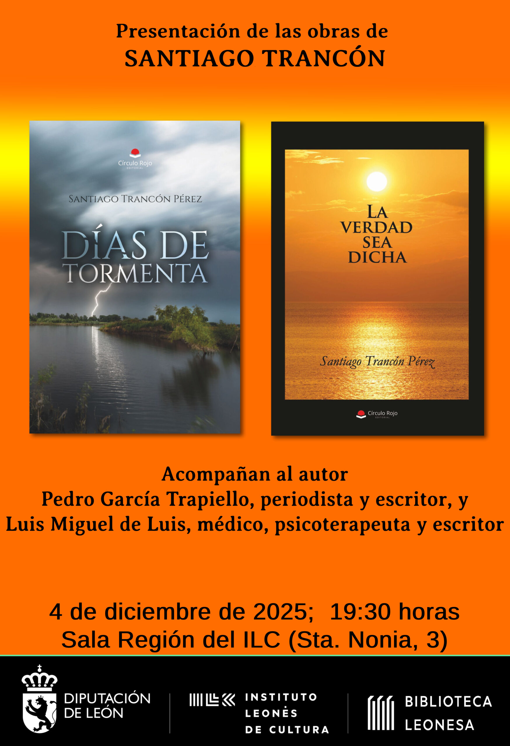 4 diciembre | 7:30 PM - 8:30 PM Presentación de las obras «DÍAS DE TORMENTA» y «LA VERDAD SEA DICHA», de Santiago Trancón Pérez