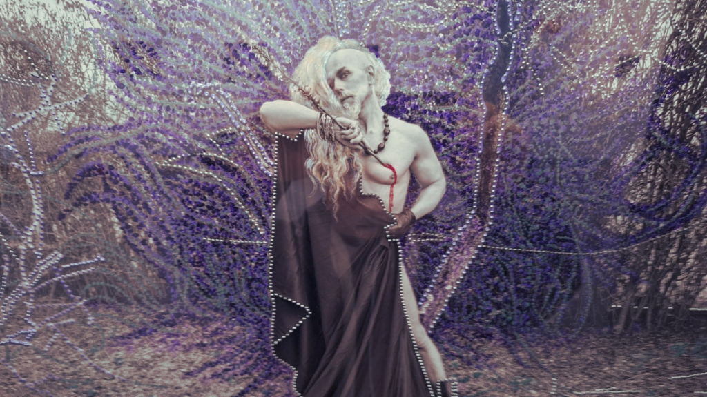 Por otro lado, la mitología emerge con gran protagonismo por medio del personaje de la xana, interpretada en dos obras por Carolina Aller, en una de las cuales brota un elemento a modo de abanico coronando su cabellera multicolor. Aquí se hace referencia, por un lado, al antruejo o antroxu tradicional leonés, con los singulares y coloridos abanicos de los guirrios, y por otro, se cita explícitamente al arcoíris LGTBIQ+ y su simbología. En esta pieza se muestra con evidencia clara ese sincretismo cultural del pasado con el presente. En la obra ‘Teleno a la luz de la luna llena’ surge una referencia a la montaña sagrada de los astures: lugar asociado a Tileno, el dios de la guerra y protector de las cosechas, identificado por Marte Tileno en época romana a causa del sincretismo religioso.